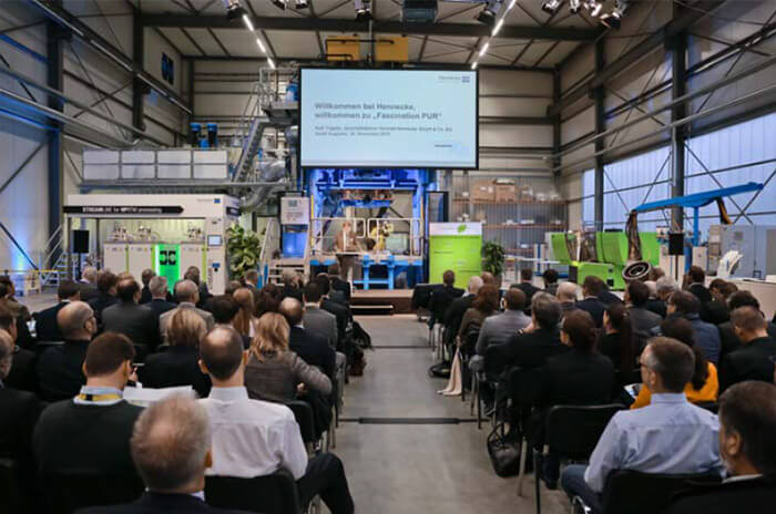 In this innovative environment, Rolf Trippler, the Managing Director of Sales at Hennecke, opened the series of presentations. He covered the historical story arc from the founding of the company to today and showed how much pioneering work Hennecke has accomplished in PU processing. During his welcoming speech, Hartwig Meier from LANXESS Deutschland GmbH and chairman of the kunststoffland NRW association, made clear that North-Rhine Westphalia is one of the most important locations for the German plastic and rubber industry. Its strength is the result of a strong network and close collaboration across the entire value chain, Meier said.