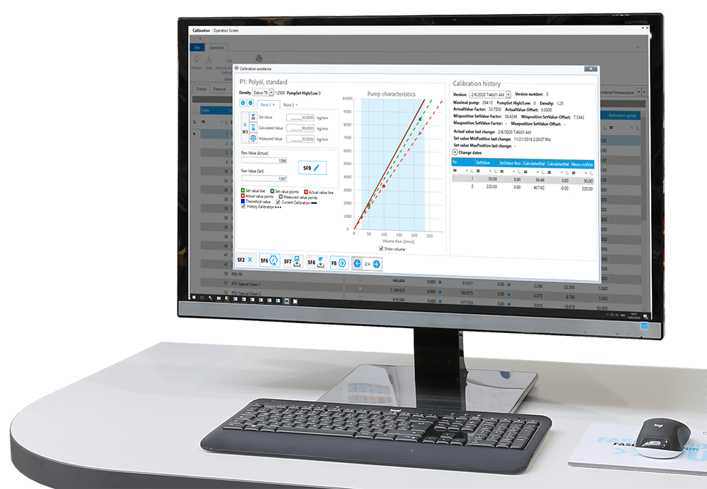 Simplified data entry with batch numbers and polyol multipliers adjustable on the fly; recipe changes can be canceled at any time; target values of selected pumps can be adjusted via plus/minus buttons; flow control per line can be deactivated during production.
